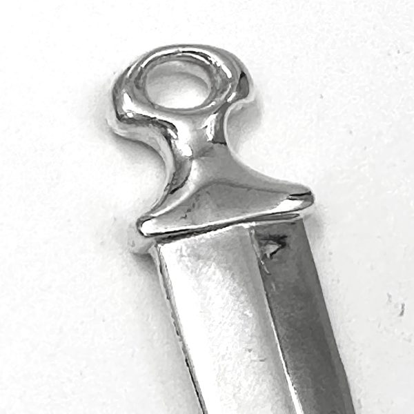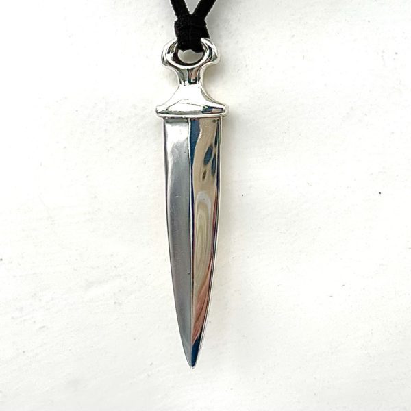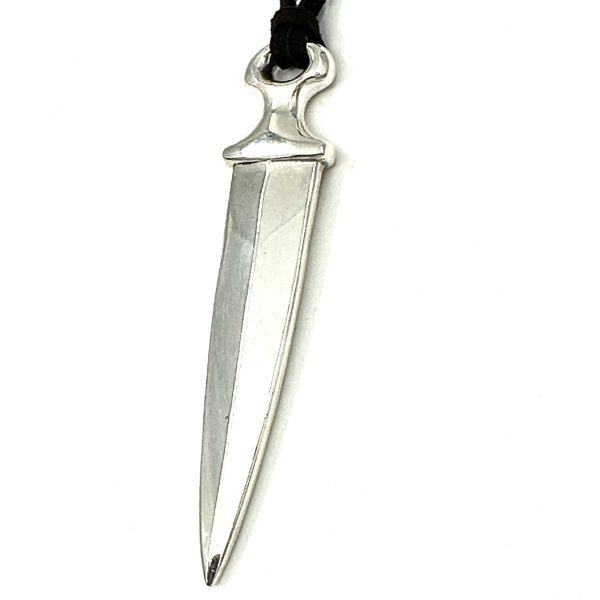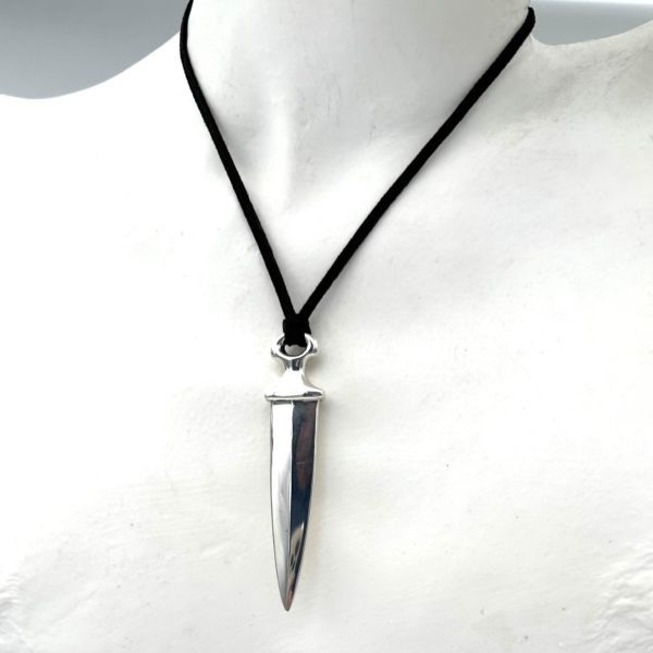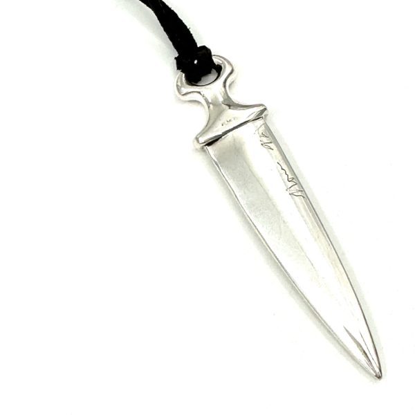 The strong, simple and stark design of the Robert Lee Morris Sterling Silver Dagger Pendant is what makes this piece so memorable. The weight alone at 1 full ounce of solid silver of this elegant piece will make one smile. It is also a visual feast. The strength of the unadorned form, the beveled blade, the large handle with hole in it makes this a must have collectors item. Designed in the mid to late 1980’s during the craze for casual jewelry in fashion and especially the concept of pendants on cords, worn as singles  or in combination with other designs was a national obsession. The story behind the dagger is male fertility and strength. It was part of a great collection of male/female myths, symbols os magic and humanity. The last photo in the gallery below shows many of the mythological pendants in a group for size comparison. This pendant comes on a black leather cord, but will also look great on a silver chain, ( not shown).