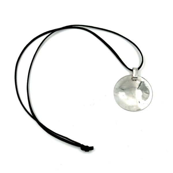 This Robert Lee Morris Sterling Silver Disc “One World” Pendant was actually a TSV (Today’s Special Value”) on QVC around 2006, with the words ONE WORLD engraved on the back of the disc. It is on a 32″ black suede cord that slides through the chunky oval bail at the top os the pendant. So this design was made in great volume but this is the only one left in the RLM archives and is being offered here as a collectors item, signed by Morris. The Sail pendant series are based on Morris sculptures which look like simple shapes of metal with wind blowing into them, giving the effect of ships sails.