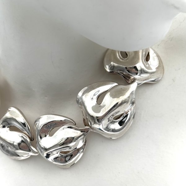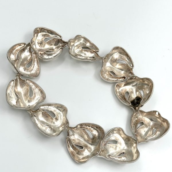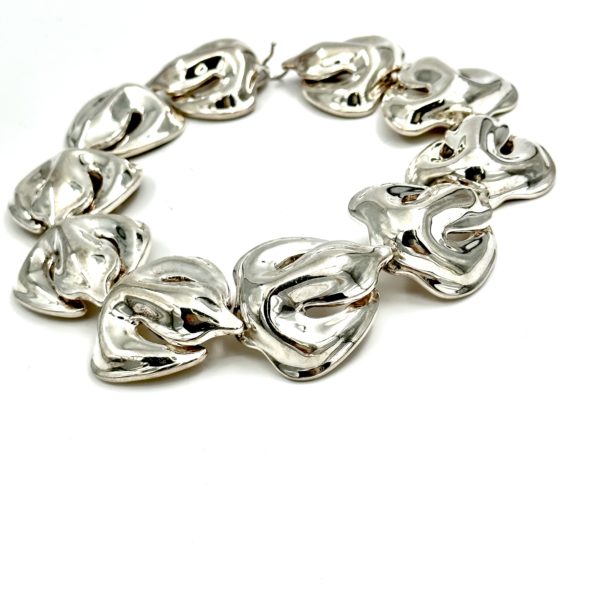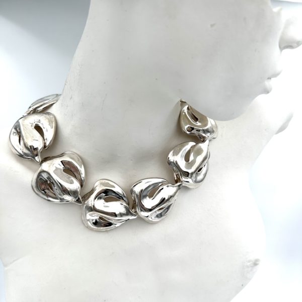 The Robert Lee Morris Sterling Silver Fleur de Lis Choker Necklace is designed to knock your socks off. It is so bold and dramatic, with 10 highly organic and sculptural Fleur de Lis forms linked invisibly into a chain that sits at the base of the neck like a silver ruffle. Impressive looking silver!! Wear it on the red carpet or to a gala affair, as this is no shrinking violet necklace. Created in the unique and original style of the sheet and wire construction, forged from behind in a sandbag to attain the bulbous full forms that are iconic RLM style. Morris is well known for his oversized, statement jewelry during the over-the-top fashion of the 80’s, working more in the gold plated brass than silver, which makes this a rare find.