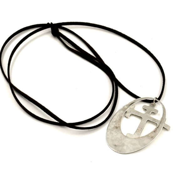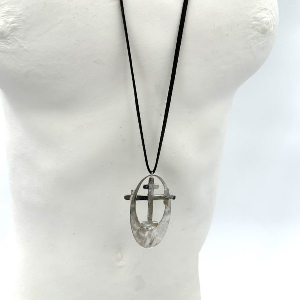 Robert Lee Morris Sterling Silver Framed Crucifix Pendant, is a one of a kind prototype whereby the classic crucifix hangs within an oval frame of forged silver sheet. Experimental construction this is the only piece of its kind in the RLM archives. Quite bold and nearly 3″ long, it comes with a black suede cord.