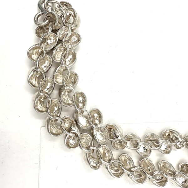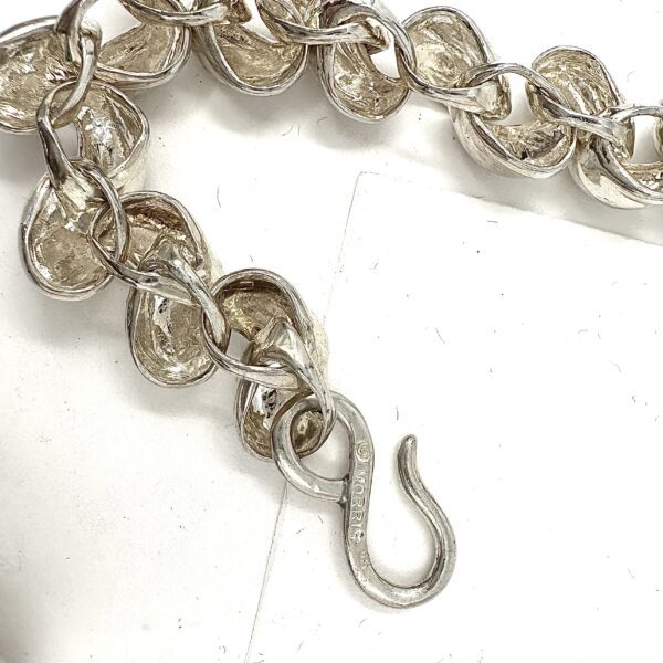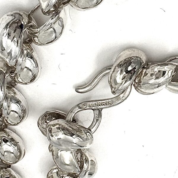 This classic iconic choker, the Robert Lee Morris Sterling Silver Small Beta Link Necklace is created with interlocking Beta forms, which are part of the Alpha family of RLM vocabulary of shapes. This twisted knuckle ring form is like a soft knot, and the way the pieces link into one another without the use of any extra connecting ring is typical of many of my constructions. I am very interested in how jewelry can be engineered to move on the human form. this is a very wearable everyday silver necklace.
