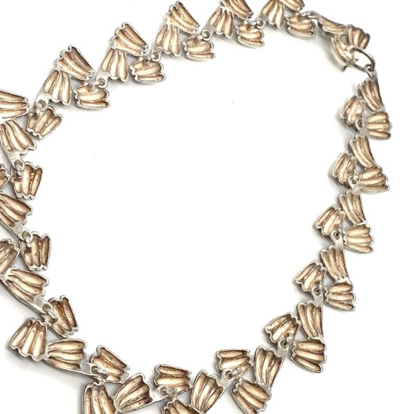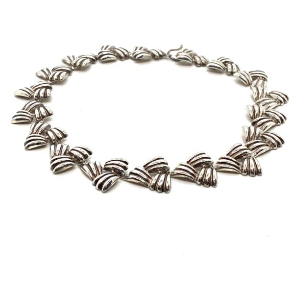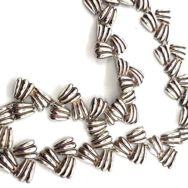 This unique Robert Lee Morris Sterling silver Spinning Ferret Feet Necklace is another example of the originality in this designers mind. The name itself is a scream. Ferret Feet? Well there was a time when there were so many new designs coming out of Morris, and he had to name everything! The little cluster of three little raised bars looked like a foot of a small mammal so this was called Ferret Foot necklace. Spinning since they were constructed into a triangular wheel design. Anyway, this necklace is very vintage, very rare, and experimental but still beautiful. It is a normal sized piece, sitting at the base of the neck and the contrast between the dark and the shiny silver is dramatic. Easy to wear with everything, this is a great find for collectors.