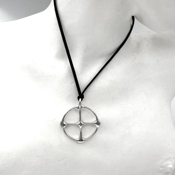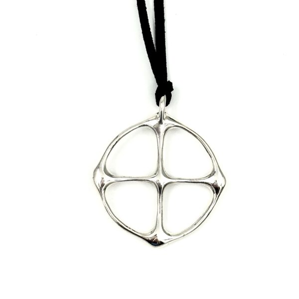 The Robert Lee Morris Sterling Silver Wheel Pendant is an elegant interpretation of the medicine wheel, with the four directions, the four seasons, and the mathematical beauty in its form. Sculpted in wax to have a flowing smooth and sensuous nature, this is a fairly lightweight piece, but commands a lot of drama.