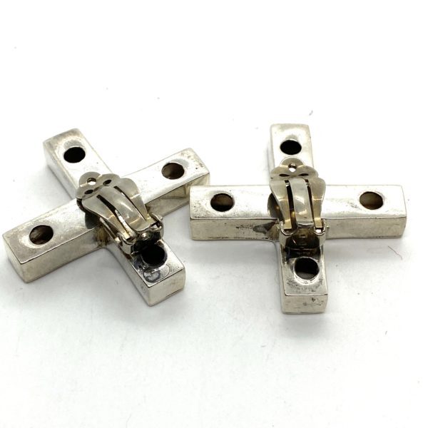 This pair of sterling silver cross earrings were designed and used in the Ann Klein shows 1983. Clip-on earrings, they are comfortable to wear and make a strong statement. They are in excellent condition after all the wear and abuse they have taken from years of being borrowed by fashion editors. Stunning scale and design.