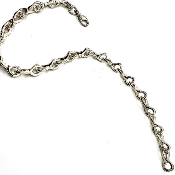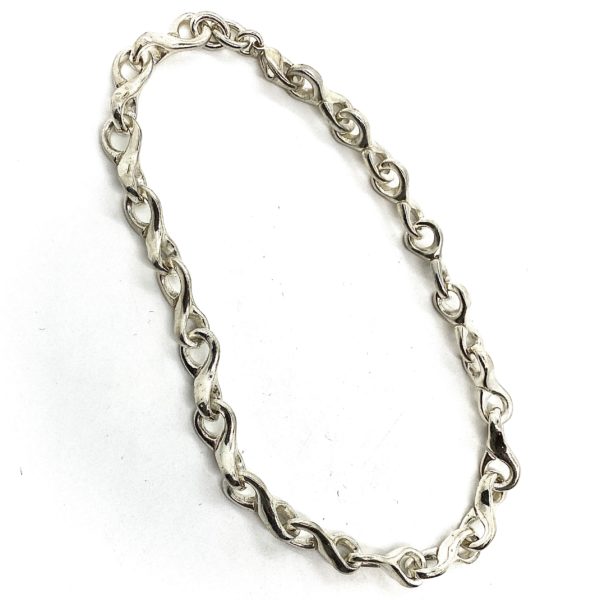 A solid chunky sterling silver necklace, at 17.5″ long, makes this a great piece for men to wear high at the neck. The solid links interlock with one another into a continuous chain that graduates in scale.