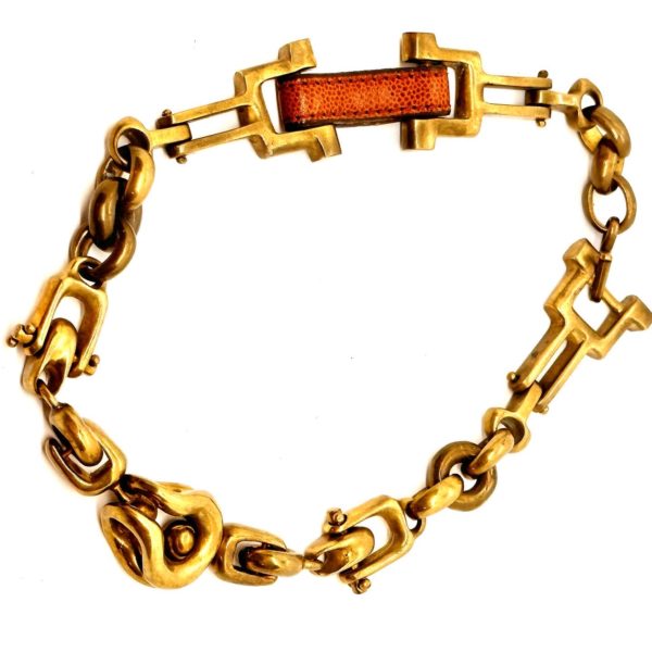 I have always loved how machines work, especially if they are founded on basic gears and pullys. In the early 19902 I carved a series of “mechanical parts” that would allow me to construct a variety of machine like movements within my jewelry. Look at the chunky brass parts in this piece, the ball and socket forms, the rivets and connections that look complex but a basically simple machine form. Using a touch of leather to add to the mix, I softened the harness of the total construction and made a rather sexy looking piece of futuristic jewelry.