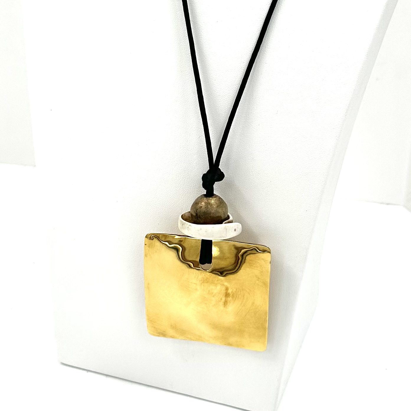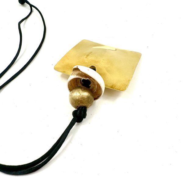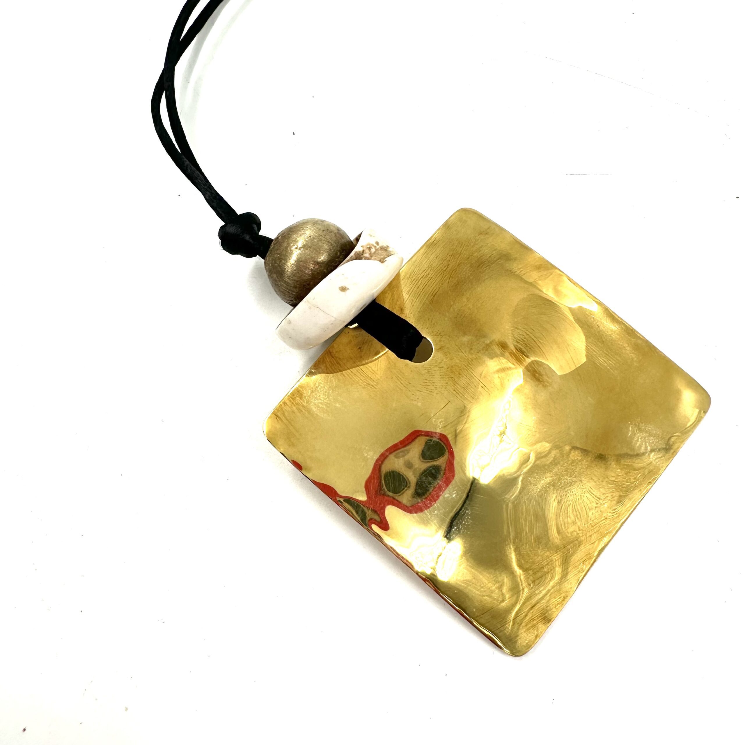 This unique Robert Lee Morris Wabi Sabi Pendant #4 is a square Sail with an African brass bead and South Sea shell. Comes with long black cord.