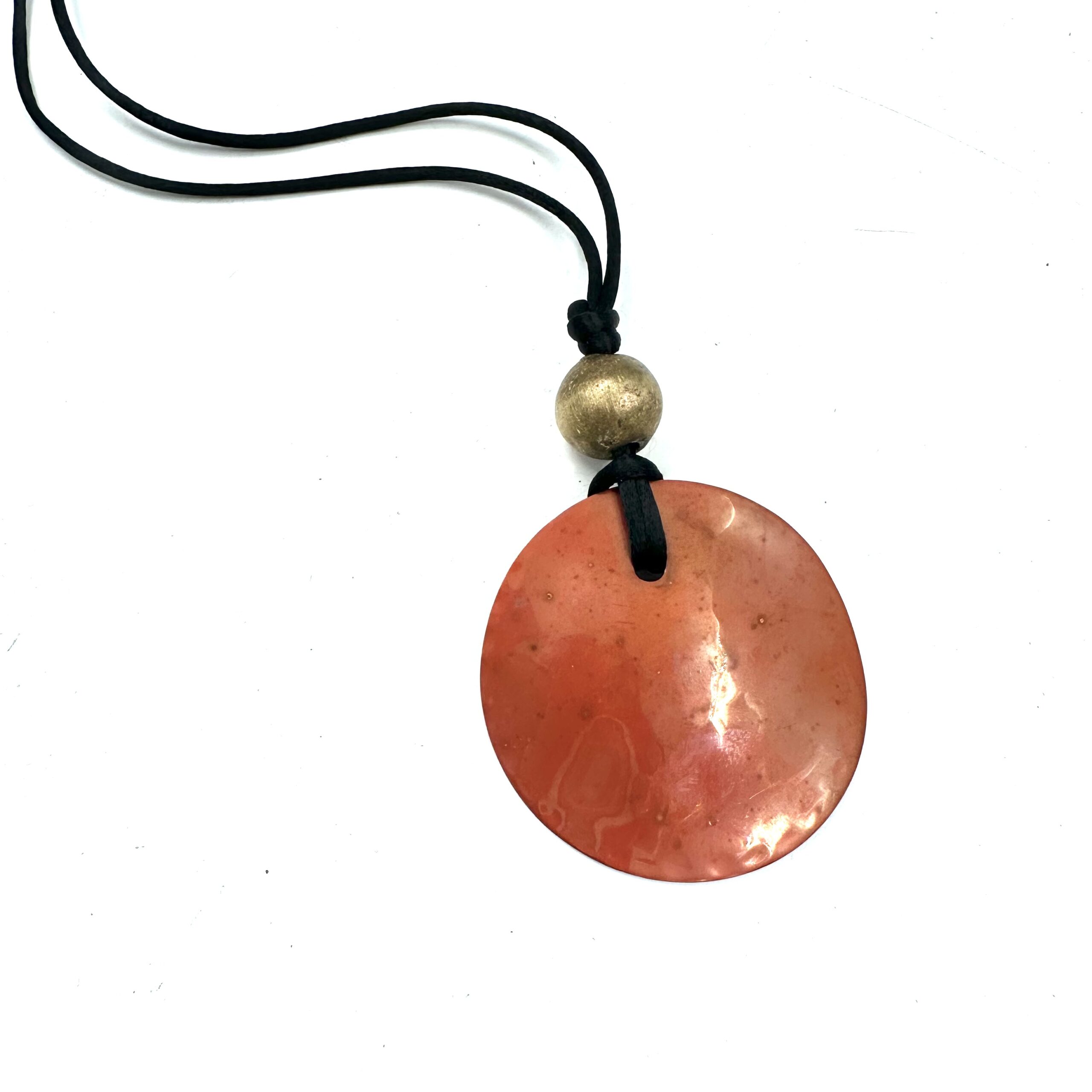This unique Robert Lee Morris Wabi Sabi Pendant #5 is an oxidized copper disc Sail with African brass bead and long black cord.