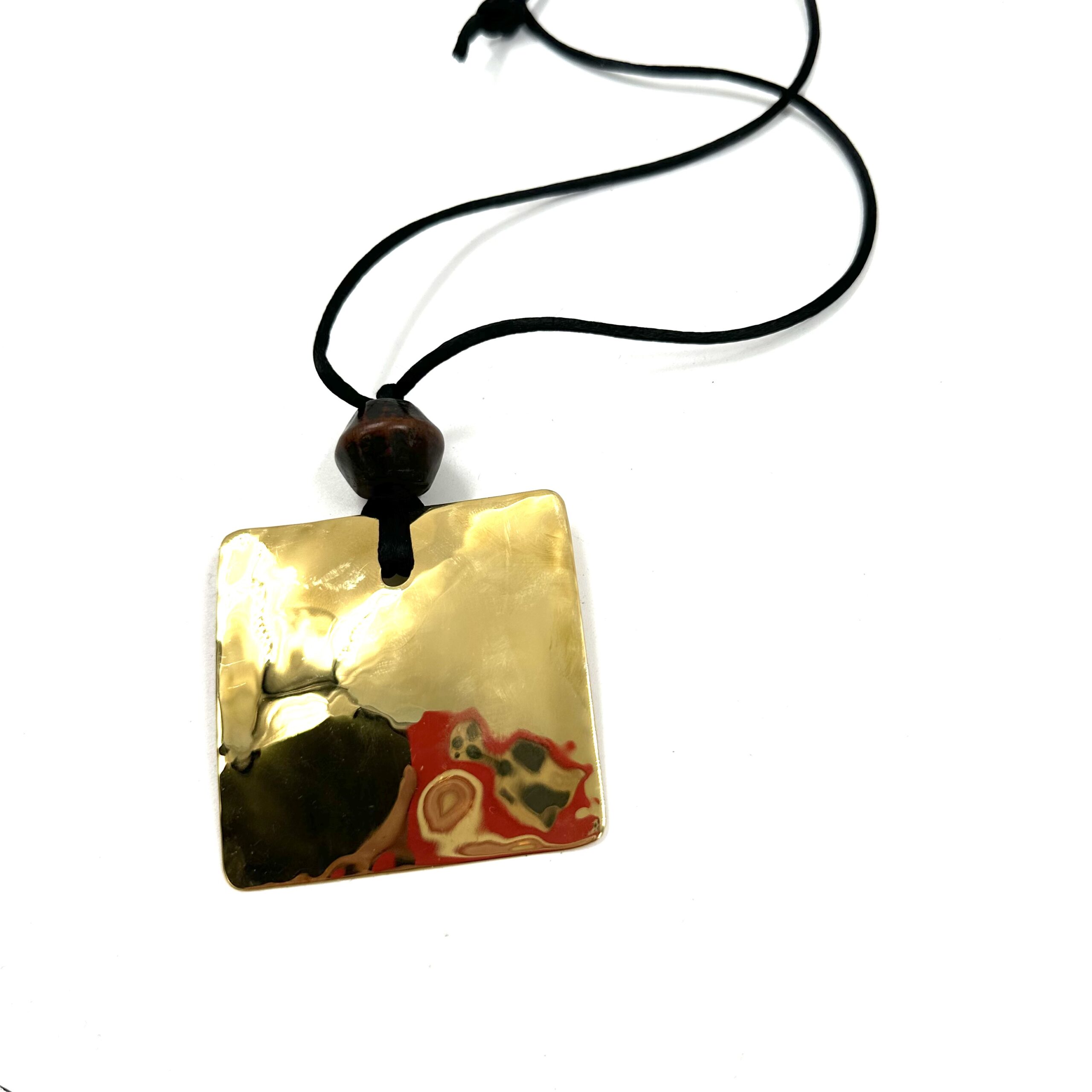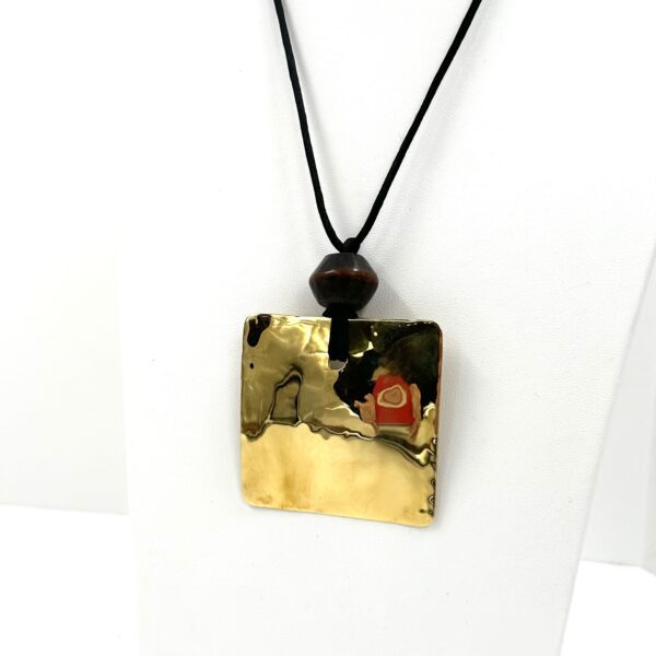 This Robert Lee Morris Wabi Sabi Pendant #7 is a brass square Sail with antique Japanese wooden prayer bead.