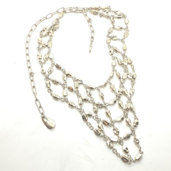 This massive sterling silver necklace weighs over a half a pound of silver. Each “raisen” is a solid casting connected into a fluid web of wrinkled pebble forms. This neckpiece was made in the early 1990’s for a Donna Karan Spring show. Long enough to wear as a belt, it has a long chain that allows for size adjustment.