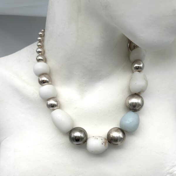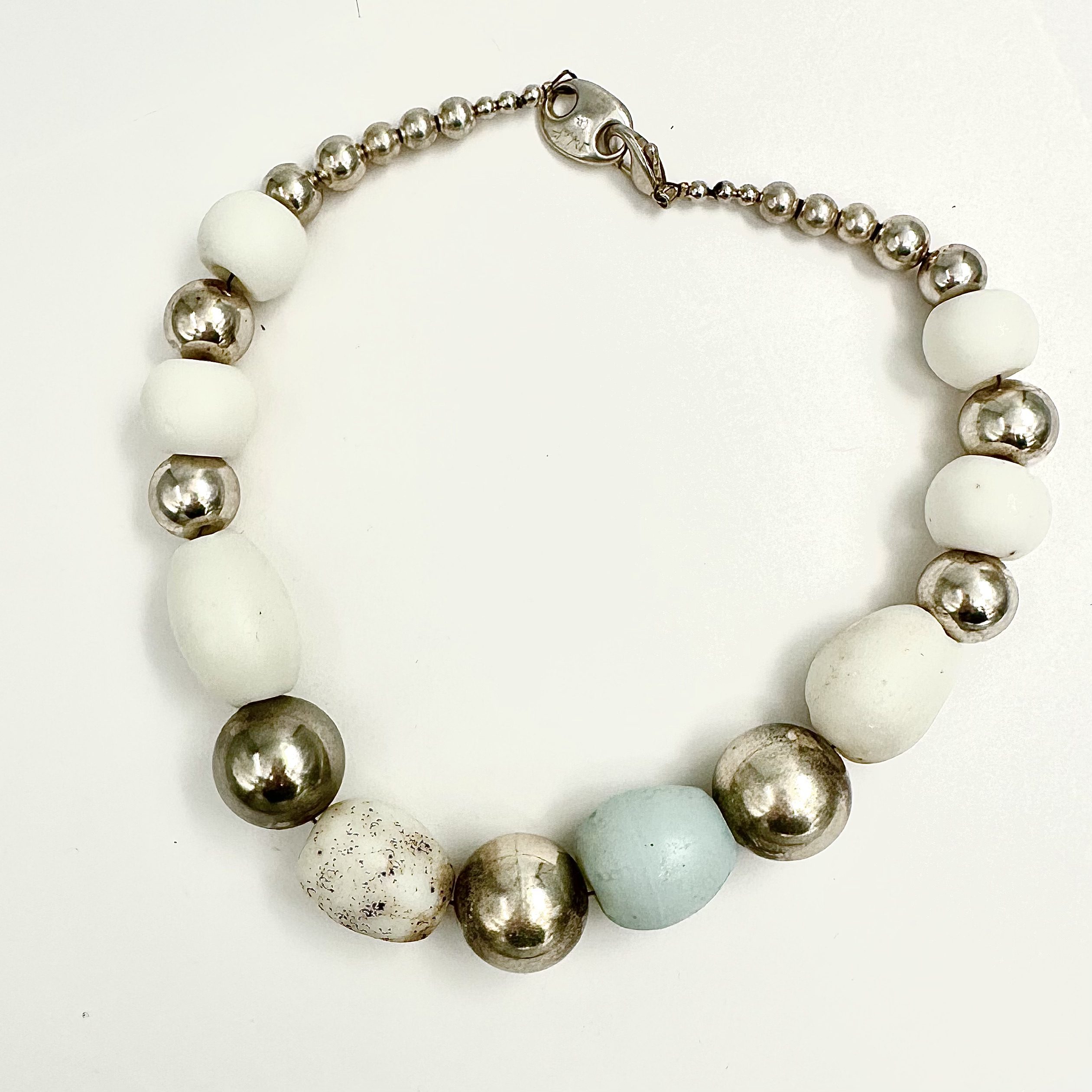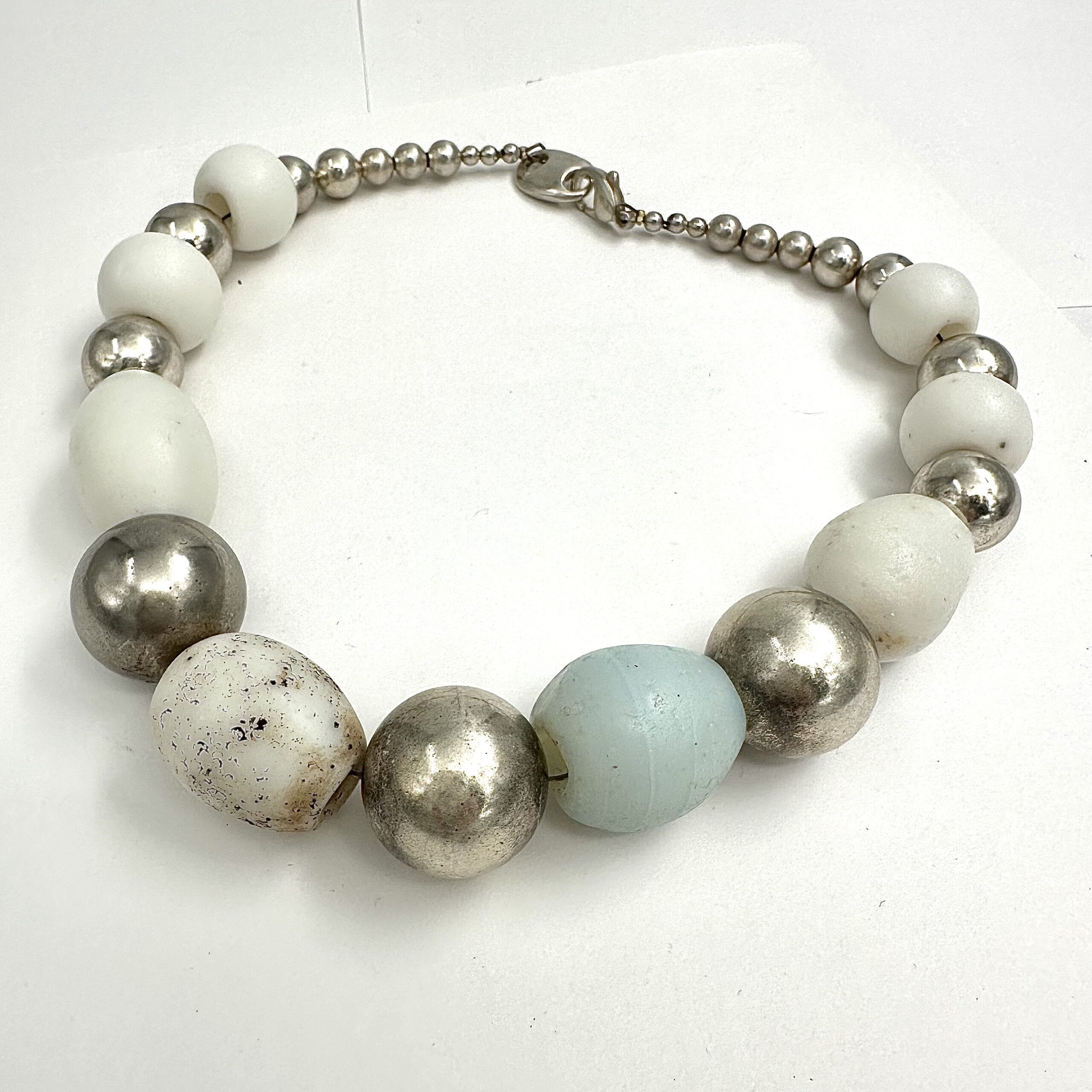 This one-of-a-kind Robert Lee Morris White Silver Bead Choker is stunning. The white African glass trading beads and the slightly off color of a few separated with gumball size silver balls, make this a knock out ne3cklace3 for a resort vacation. The silver lobster closure is chunky and strong.