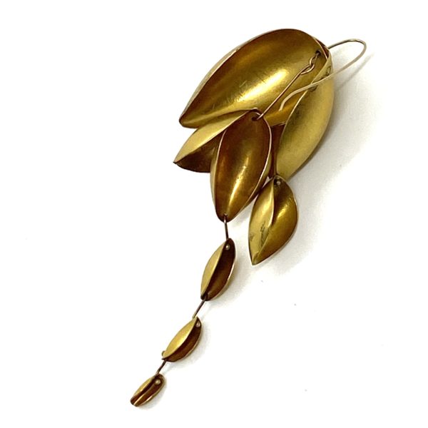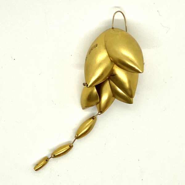 Another spectacular single earring by Ted. This construction of a volumetric shell shape, pinched at one end, became a signature form and Icon for Ted’s brand image. This is an earring from the super trend of One Earring in the early 80’s, and it is all connected with tiny rivets and it moves and is glamorous to boot. 24k gold plated brass. 14k ear wire. The Asparagus construction of bulbous forms building upon one another is echoed in many of his lated earring designs.