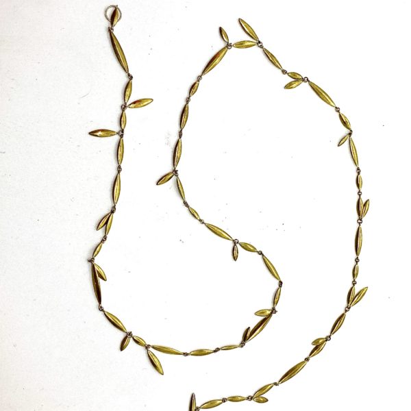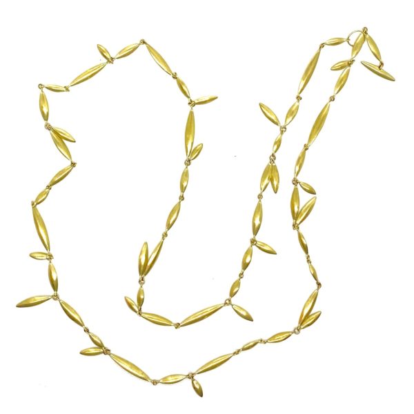 This delicate and iconic Ted Muehling necklace, sterling silver plated with green gold, is 32.5″ long and created in the mid 1980’s. The main linked chain is made of 3 different sized rice shaped ovals, with many dangling off the chain to create a beautiful movement.