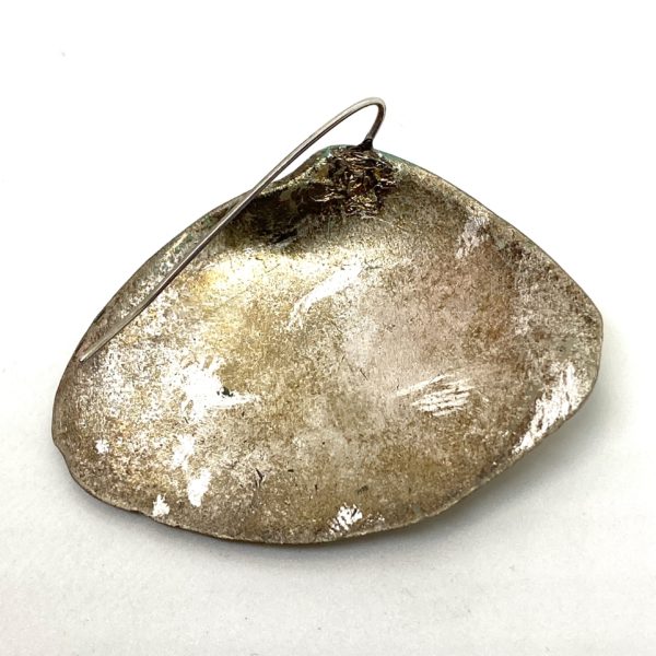 In the mid 1980’s, Ted Muehling created a sensation with his acrylic jewelry. ย Like a magician, he was able to transform plastic into a magical element, using gold or silver leaf on the back, each piece glowed as if made of some unearthly material. The combination of a finely sanded, matte surface, the reflected light and the shapes created a mysterious look, extremely beautiful. I bought a wide variety of his acrylic work and so glad I did as these are now very rare and precious pieces of a master’s touch. The SARDINES were named because of the elongated fish like form, and the MOTH WINGS were exquisitely colored and wing shaped single earrings. The coloration was always very unique, and often with an ombre effect, shaded, and sophisticated. Most of these earrings were sold as singles, when single earrings were all the rage in the 80’s. It was rare to even find two that were exactly alike, as a pair. Extremely lightweight, with a silver wire, the coloration is like a painting of a desert sky. The silver leaf on the back is quite tarnished, but the way the silver comes through the front is magical.
