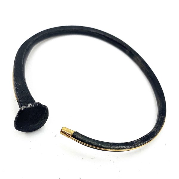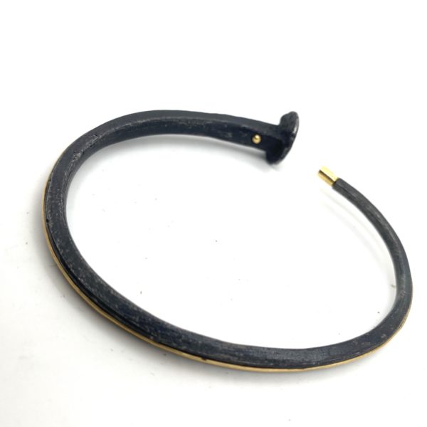 This very simple cuff bracelet is an iron nail, with a strip of 18k gold that runs along the outside of the shape, ending with a gold tip. Minimal, and stark, and the use of the iron nail is iconic Vigeland style.